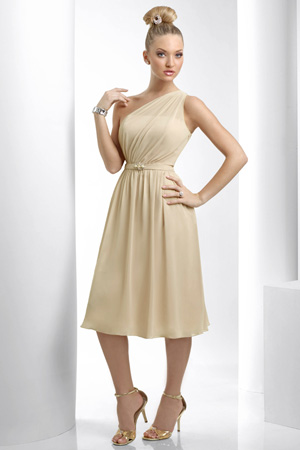 915 Published July 12, 2015 at 300 × 450 Bari Jay 915 Beige sz14 Tea Length Bella Chiffon One-shoulder. Waist is accented by a beaded belt