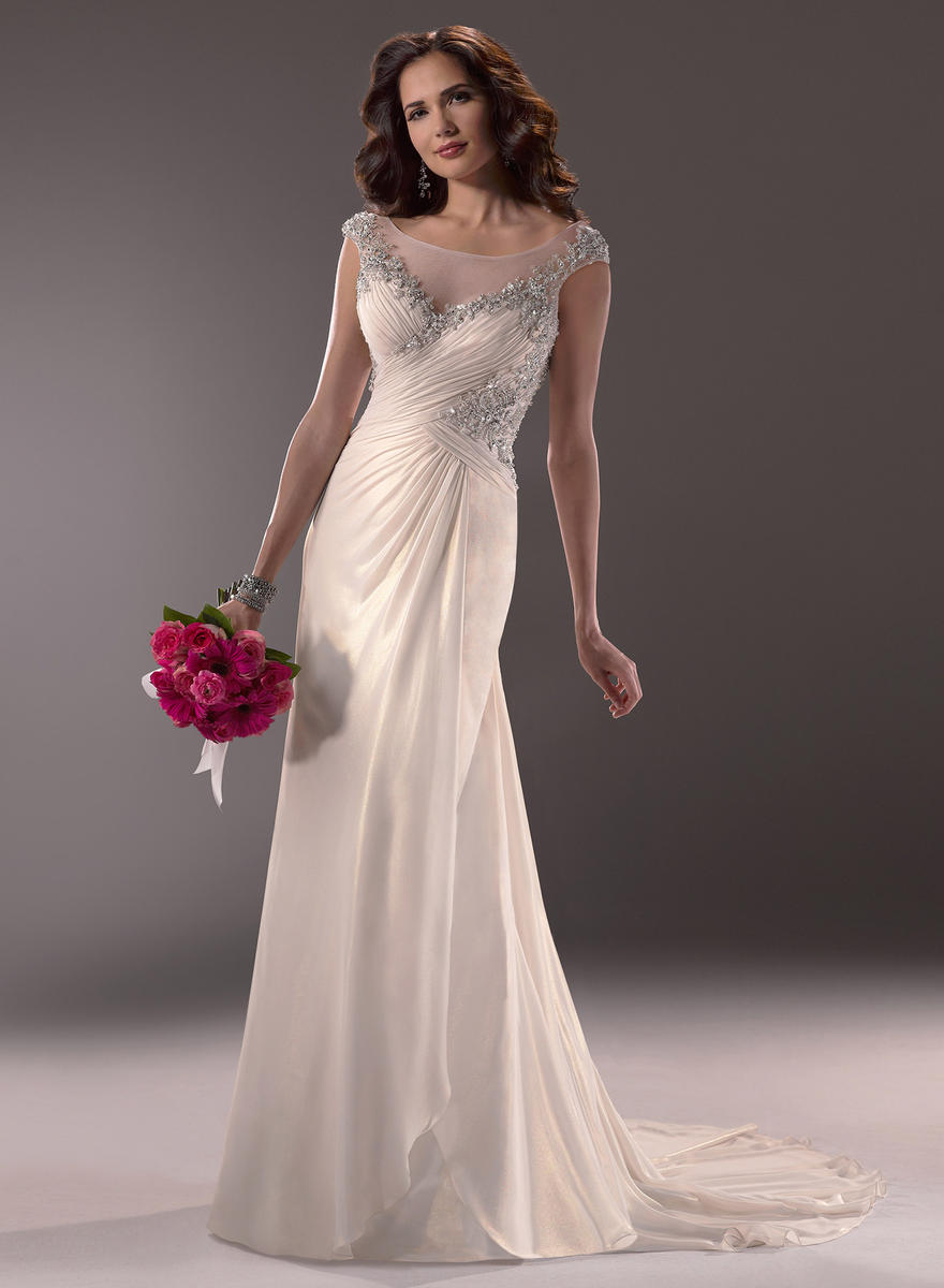 Maria Published February 22, 2016 at 880 × 1200 Sottero Maria sz12 Metallic Chiffon gown with illusion bateau neckline trimmed in Swarovski crystals. Finished with jeweled cap-sleeves and zipper