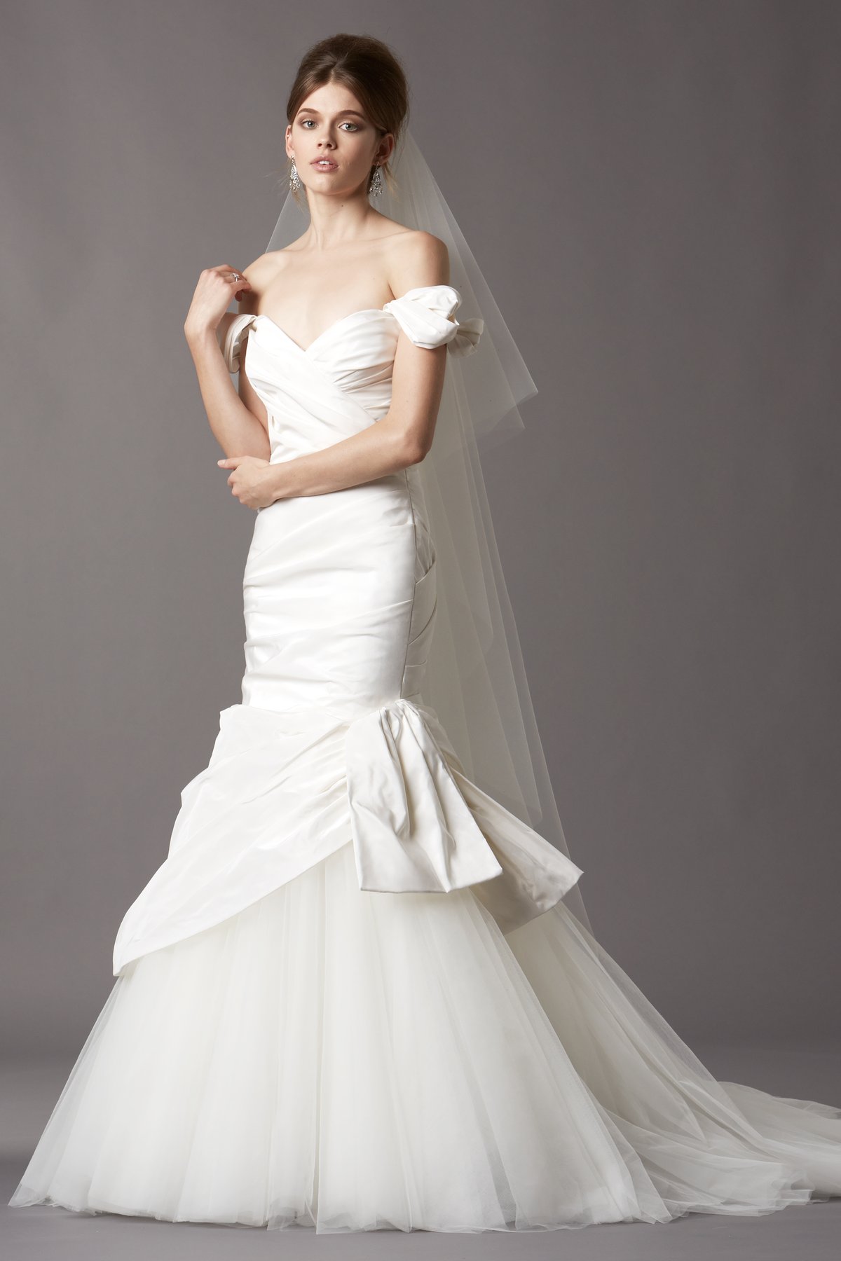 trudie Published April 23, 2015 at 1200 × 1800 Watters Trudie sz12 Haute Couture silk taffeta and tulle mermaid gown. Sweetheart neckline, beautifully structured off shoulder straps, an asymmetrically draped drop waist bodice, and a flared skirt of 60 yards of luscious tulle with a drape overlay