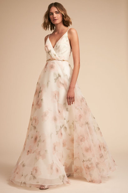 Carolina Published December 18, 2018 at 410 × 615 Jenny Yoo Carolina sz0 Printed Organza with blossoms in subtle hues, this sleeveless gown features a plunging surplice bodice that gives way to an A-line skirt.