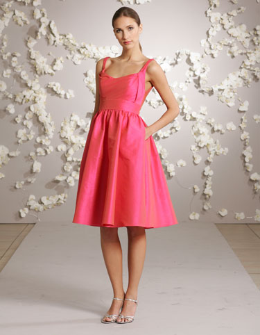 5007 Published March 22, 2016 at 375 × 482 Jim Hjelm 5007 sz12 Strawberry Dupioni A-line tea-length dress, scoop neckline, gathered high-waisted skirt, side pockets.