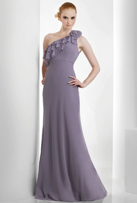 919 Published October 6, 2015 at 460 × 680 Bari Jay 919 sz12 Wisteria Bella Chiffon. One Shoulder ruffle bodice with flower detail pin.