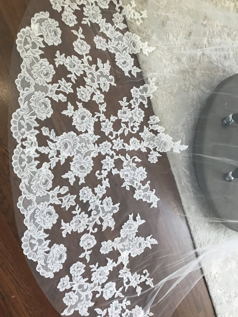 9849 Published July 31, 2021 at 1000 × 1333 Liancarlo Stunning French lace on illusion tulle with floral applique on the center back. 95 inches long.