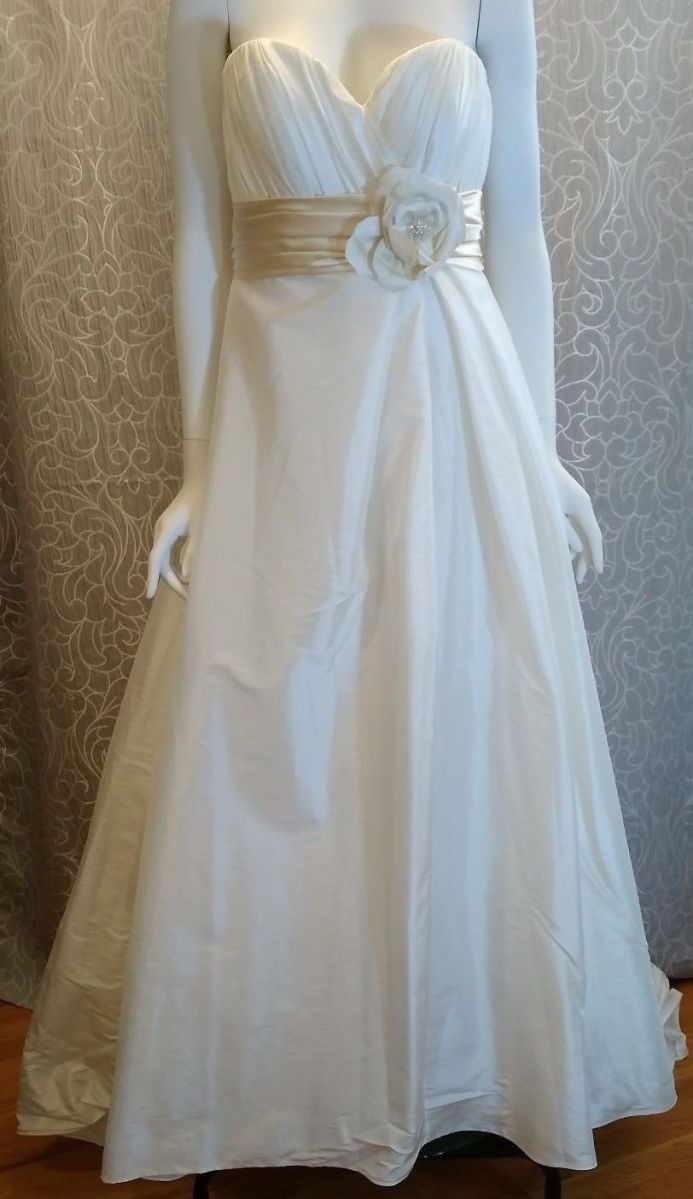 a028 Published November 4, 2018 at 812 × 1404 Casablanca a028 sz16 Silky Taffeta strapless A-Line gown, with a sweetheart neckline. Silk Flower at the waist with Freshwater pearls, rhinestones and Swarovski crystals on a champagne sash. Buttons line the back of the gown.