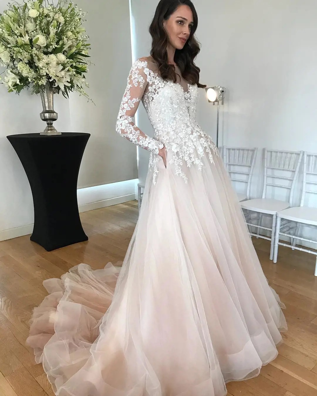 Alba Published February 16, 2025 at 1080 × 1350 Kelly Faetanini Alba sz10 Beaded, embroidered long sleeve illusion ombre ball gown with horsehair hem and pockets. In blush