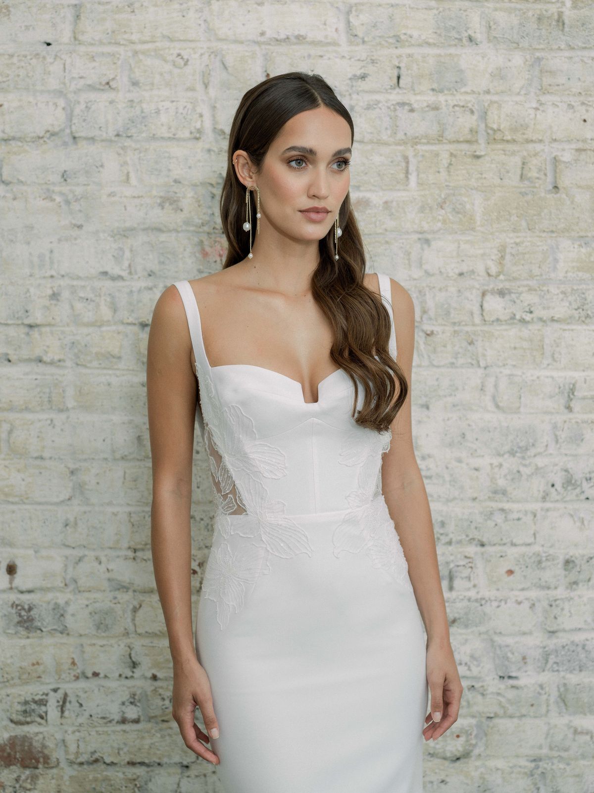 alba Published October 18, 2025 at 1200 × 1601 Rime Arodaky Alba sz10 Fitted high waisted gown with an elegant boned corset top. An artful neckline and low back, Hand appliques, sequin flowers and sequin lace train.