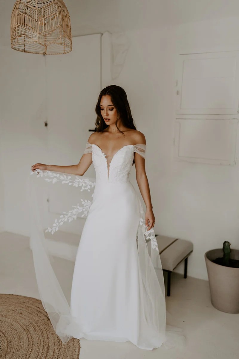 Introducing Alba – the perfect match of elegance and romance. With the most feminine of necklines, Alba has a romantic lace plunging neckline bodice and soft tulle bardot sleeves. Sitting beautifully with our fitted crepe skirt. The perfect bridal addition, the Alba Overlay adds an extra layer of soft romantic tulle with delicate floral lace,