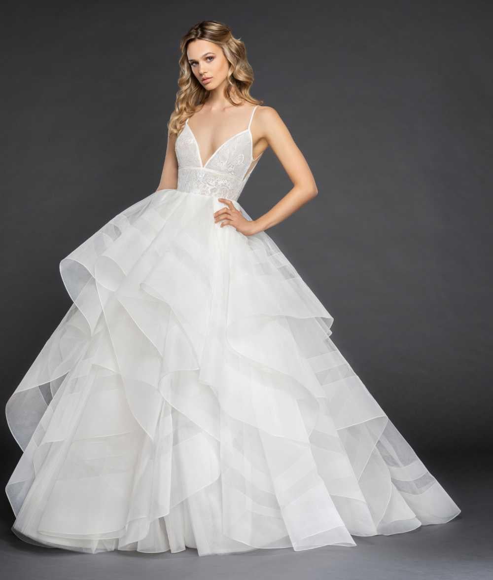 aldridge Published June 27, 2025 at 1000 × 1176 Hayley Paige Aldridge sz4 Lace and tulle ball gown, natural waist bodice with nude lining and ribbon trim, deep sweetheart neckline and keyhole back with illusion detail, full cascading skirt with double-horsehair trim.
