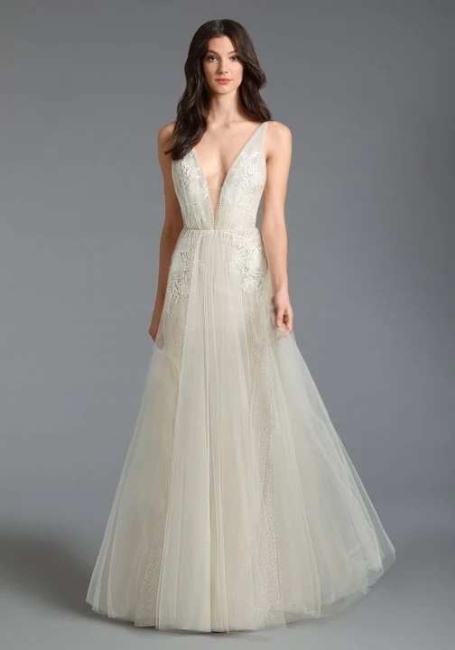 alessandra Published October 6, 2023 at 504 × 720 Tara Keely Alessandra sz10 Shimmer trumpet gown with tulle overlay, plunging V-neckline with sheer open back, Venise lace applique bodice and side skirt, natural waist, shimmer fitted skirt with tulle overlay gathered at back, chapel train.