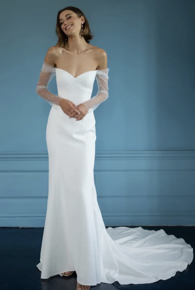 alexandra Published July 16, 2025 at 740 × 1103 Jenny Yoo Alexandra sz10 The Alexandra gown is thoroughly modern, with just a touch of whimsy. The fit and flare silhouette is cut in soft stretch crepe. Delicate, sheer long sleeves dotted with lustrous pearls. Buttons down the back