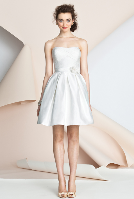 Strapless modified pleated short ball gown with soft sweetheart neckline. Bodice is gently draped with a subtle geometric tulle overlay. The waist is accented with a layered belt and a bouquet of textured silk and tulle flowers, sprinkled with crystal beading.