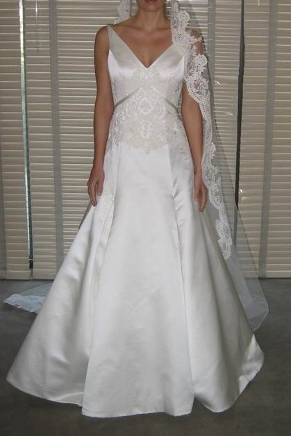 Gilmore Published October 28, 2014 at 419 × 628 Anne Barge sz8 petite Ivory pearl silk satin with alencon lace on bodice. The gown is sleeveless, v-neck with a chapel train and small bow at back of dress.