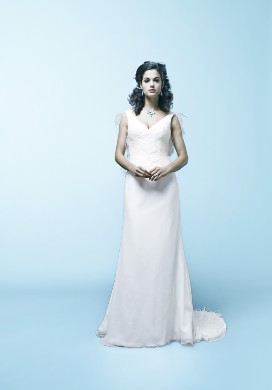 Aphrodite Published December 31, 2017 at 550 × 788 Matthew Christopher Aphrodite sz10 Creamy silk satin criss-cross pattern bodice and v back with ostrich feathers and floral appliques at low back