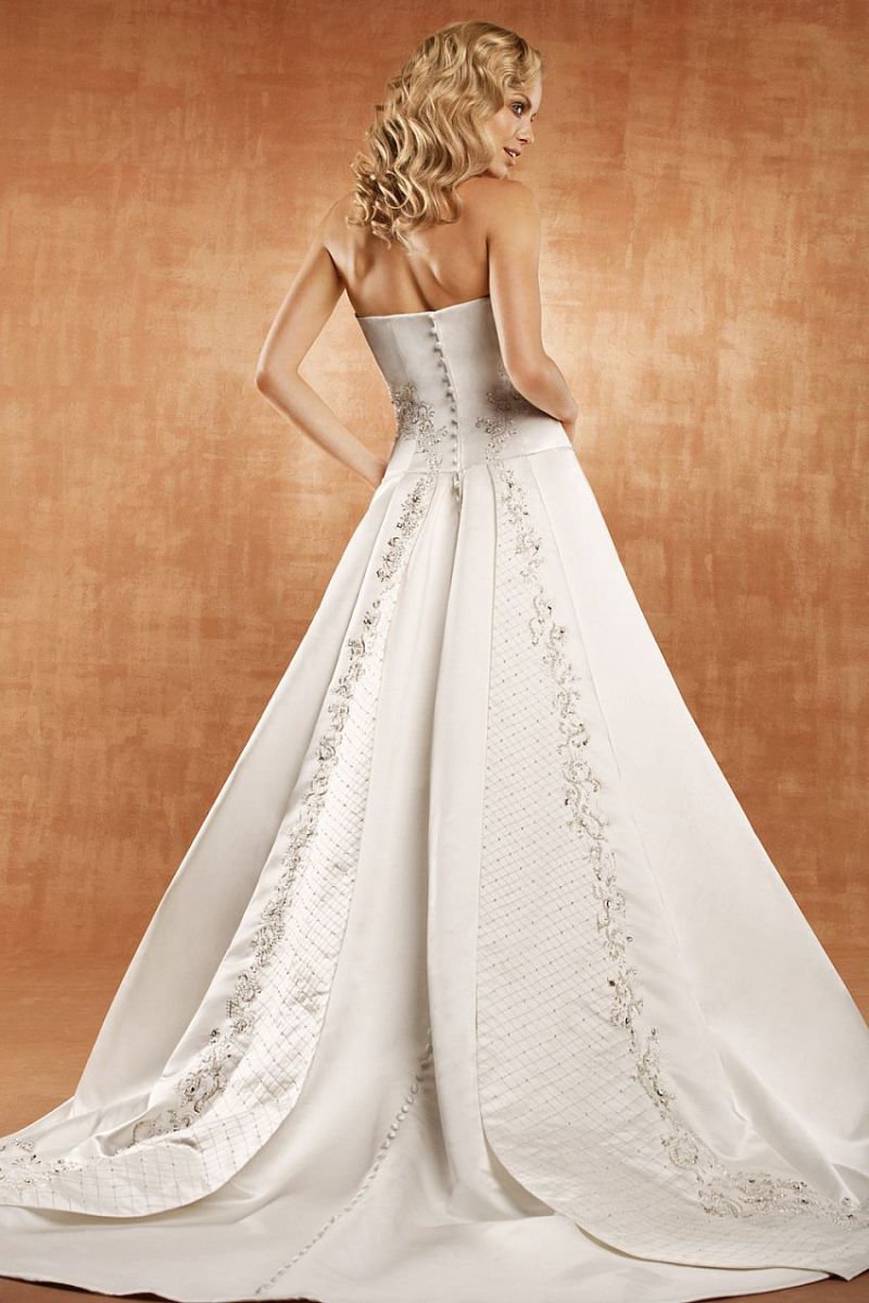 B3056 Published December 6, 2012 at 850 × 1275 Saison Blanche B3056 sz10 Beautiful silver metallic embroidery and crystal details on the bodice and down the back of the train. Inner corset built into dress for amazing fit. Matte satin.