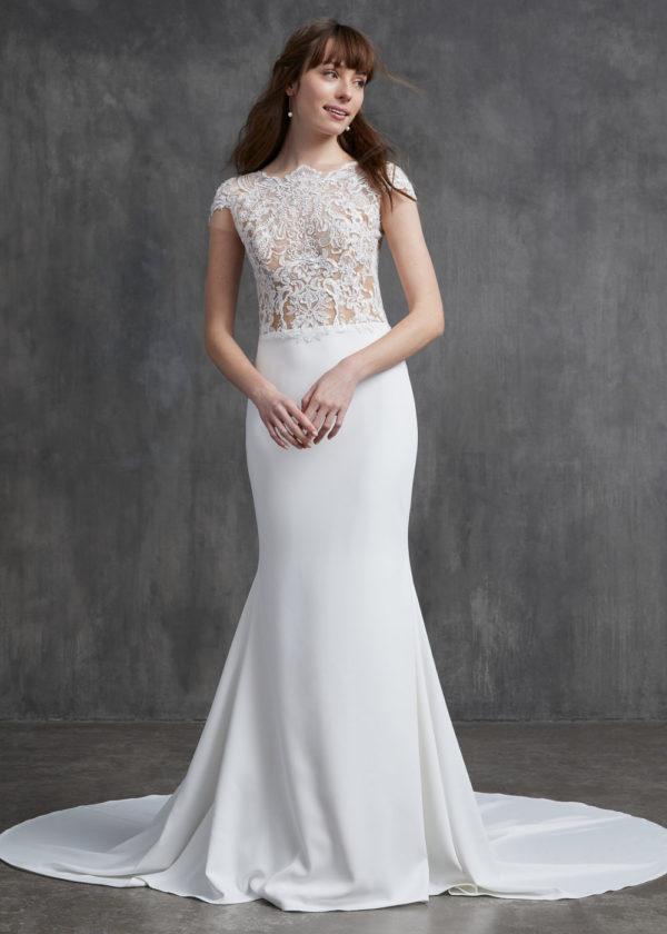 Bardot Published November 13, 2025 at 600 × 840 Kelly Faetanini Bardot sz12 Crepe fit-to-flare with a bateau neckline embroidered tulle corset cap sleeves