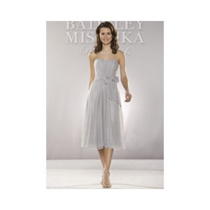 950315 Published August 22, 2013 at 428 × 428 Badgley Mischka 950315 sz10 Silver Classic strapless tulle dress is tea length. The slight sweetheart neckline melts into the cinched drop waist, which is accented with a charmeuse bow tied to one side. The loose flowing skirt is simple and elegant