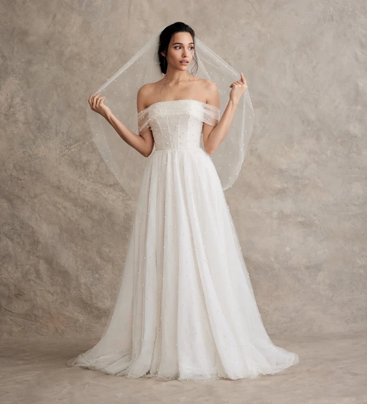brielle Published June 4, 2024 at 720 × 792 Ti Adora Brielle sz26 Stunning ivory dotted pearl tulle over cashmere lining. Crescent strapless bodice, full a-line skirt at natural waist. Illusion draped off shoulder adds a romantic touch