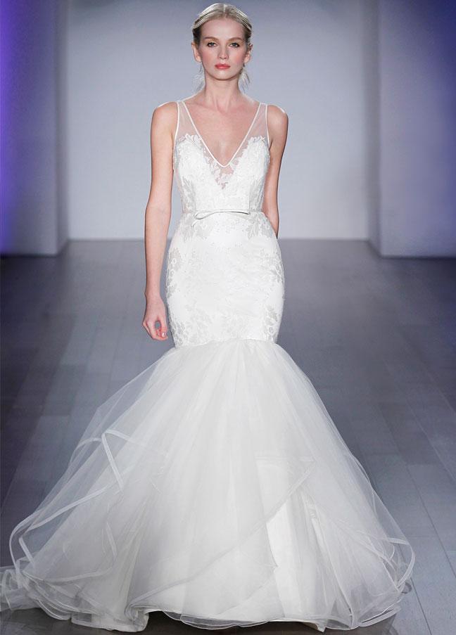 brooke Published January 14, 2021 at 648 × 903 Hayley Paige Brooke sz12 Lace fit to flare gown, elongated bodice with plunging curved v illusion neckline, thin bow belt at natural waist, flounced skirt with horsehair edging