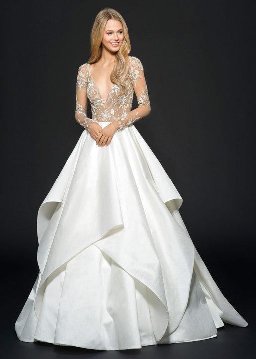 collins Published December 26, 2020 at 514 × 720 Hayley Paige Collins sz12 Long sleeve ball gown, illusion bodice with shimmer rose embellishment, curved V-neckline and keyhole back, cascading dupioni skirt