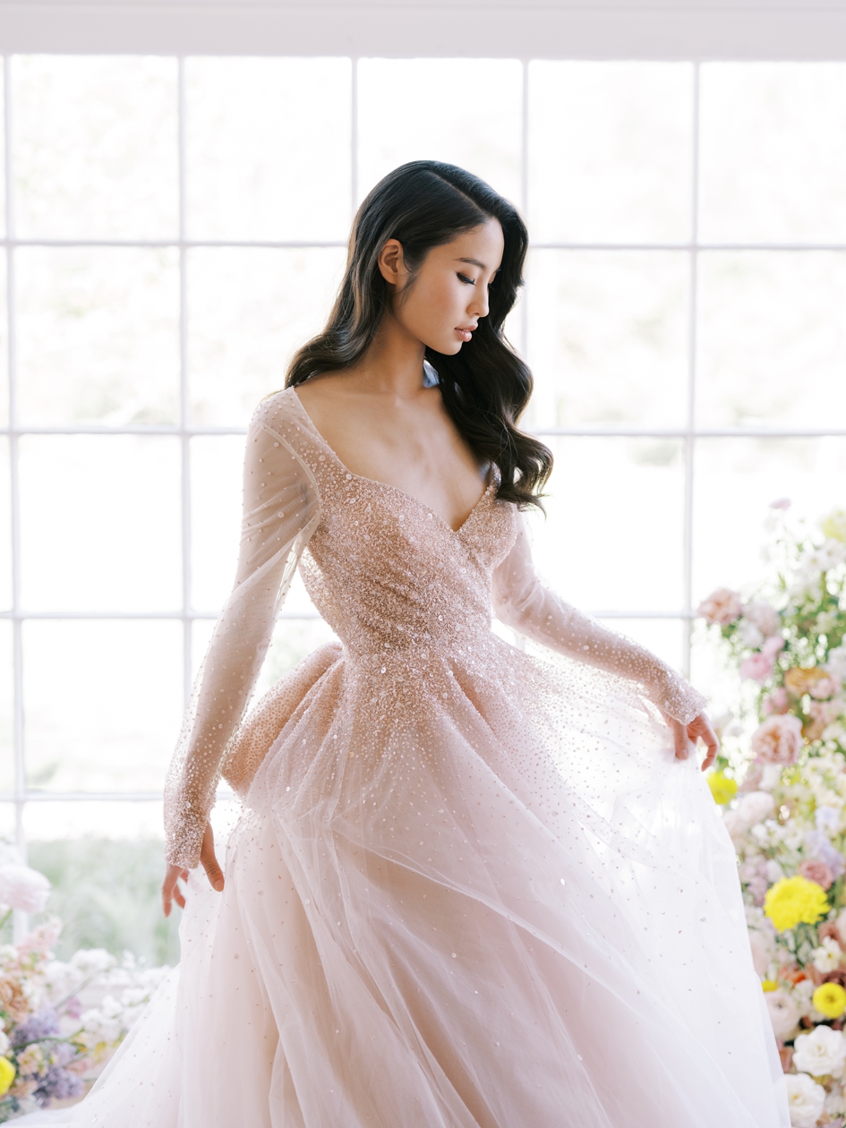 Kinley Published October 18, 2025 at 945 × 1260 Allsion Webb Kinley sz10 Blush net and twinkle tulle A-line gown with pearlescent sequins adorning the bodice and illusion sleeves.