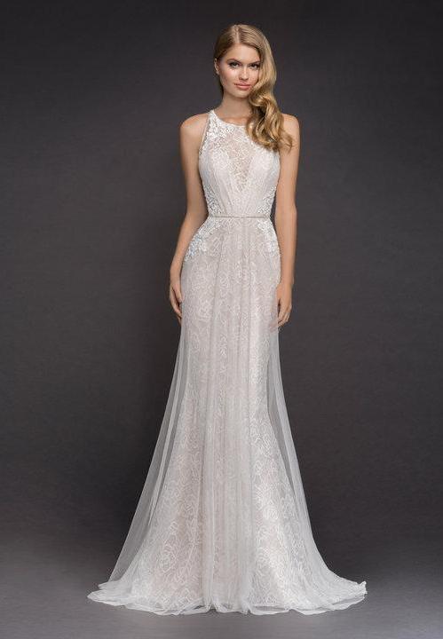 Dawson Published September 21, 2021 at 499 × 720 Hayley Paige Dawson sz10 Ivory net gown with layered lace and cashmere lining, jewel neckline with beaded accent, draped net crisscross back, full skirt with fitted underlay.