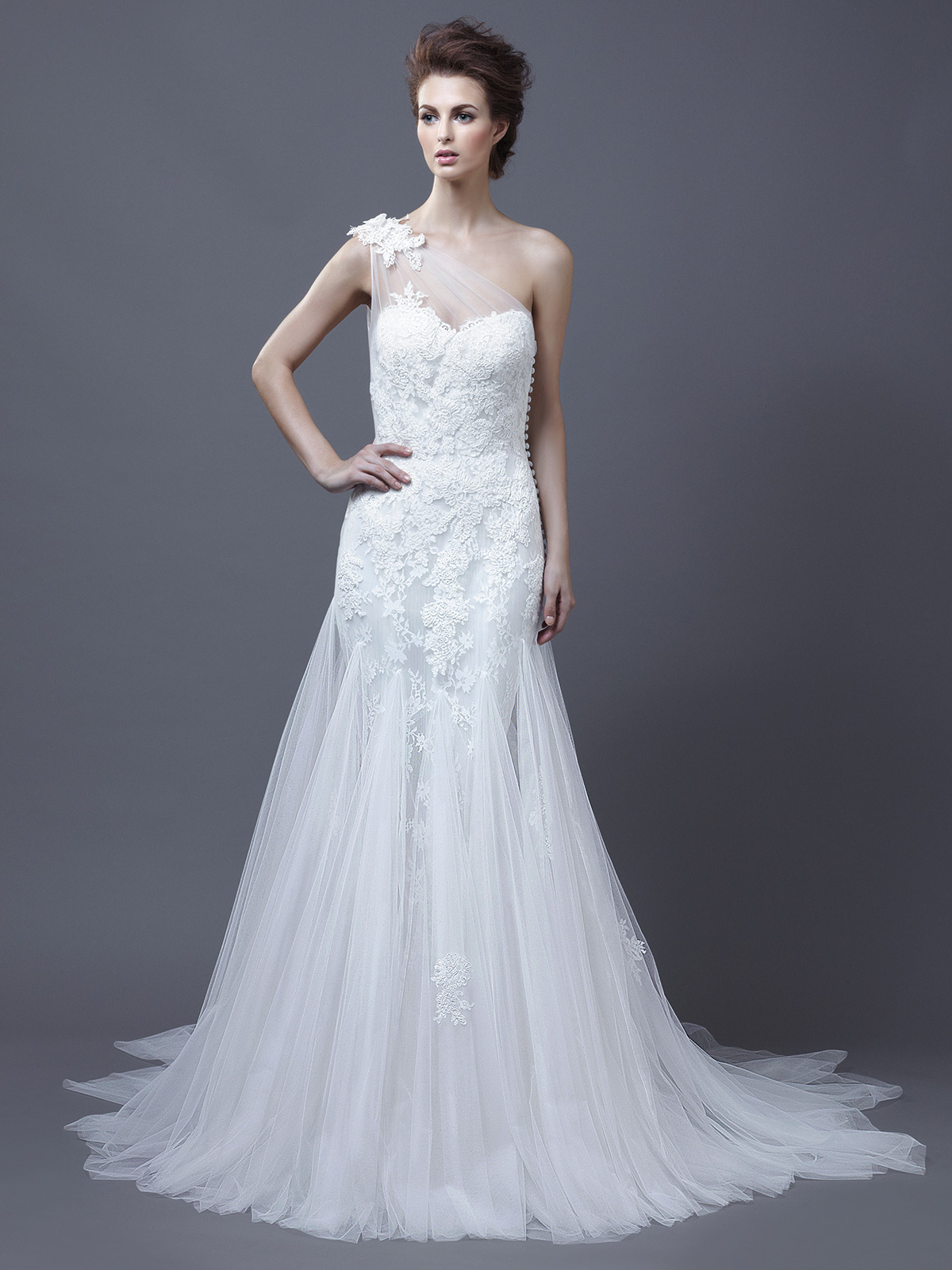 heli Published July 26, 2015 at 1200 × 1601 Enzoani Heli sz12 Romantic lace overlay dress with a strapless sweetheart neckline, a fitted bodice and scalloped edges. Can be worn with or without the one-shoulder illusion overlay