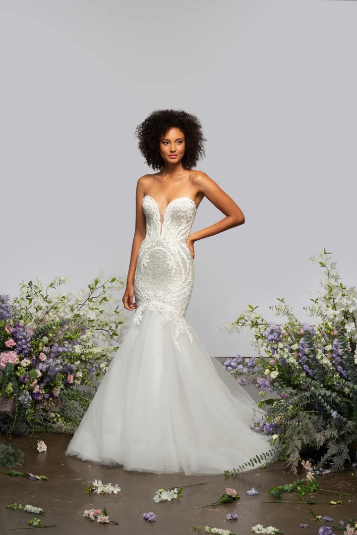 frankie Published October 6, 2023 at 720 × 1080 Hayley Paige Frankie sz10 Nightshine sparkle fit to flare, strapless plunging sweetheart, sparkle embroidered elongated bodice, full layered skirt of tulle and organza with applique detail.