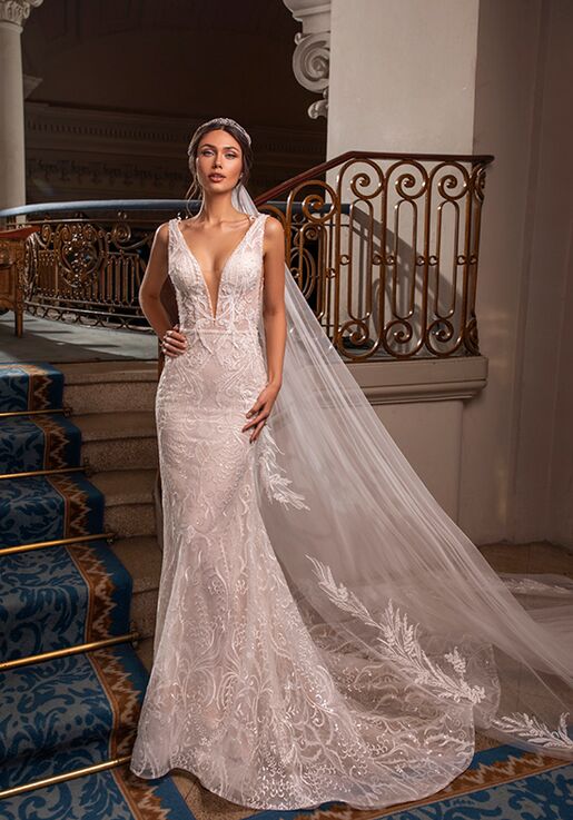 Garbo Published October 18, 2025 at 515 × 737 Pronovias Garbo sz12 Traditional handmade lace on a fitted évassée gown that features an ultra plunge back and sensual neckline.