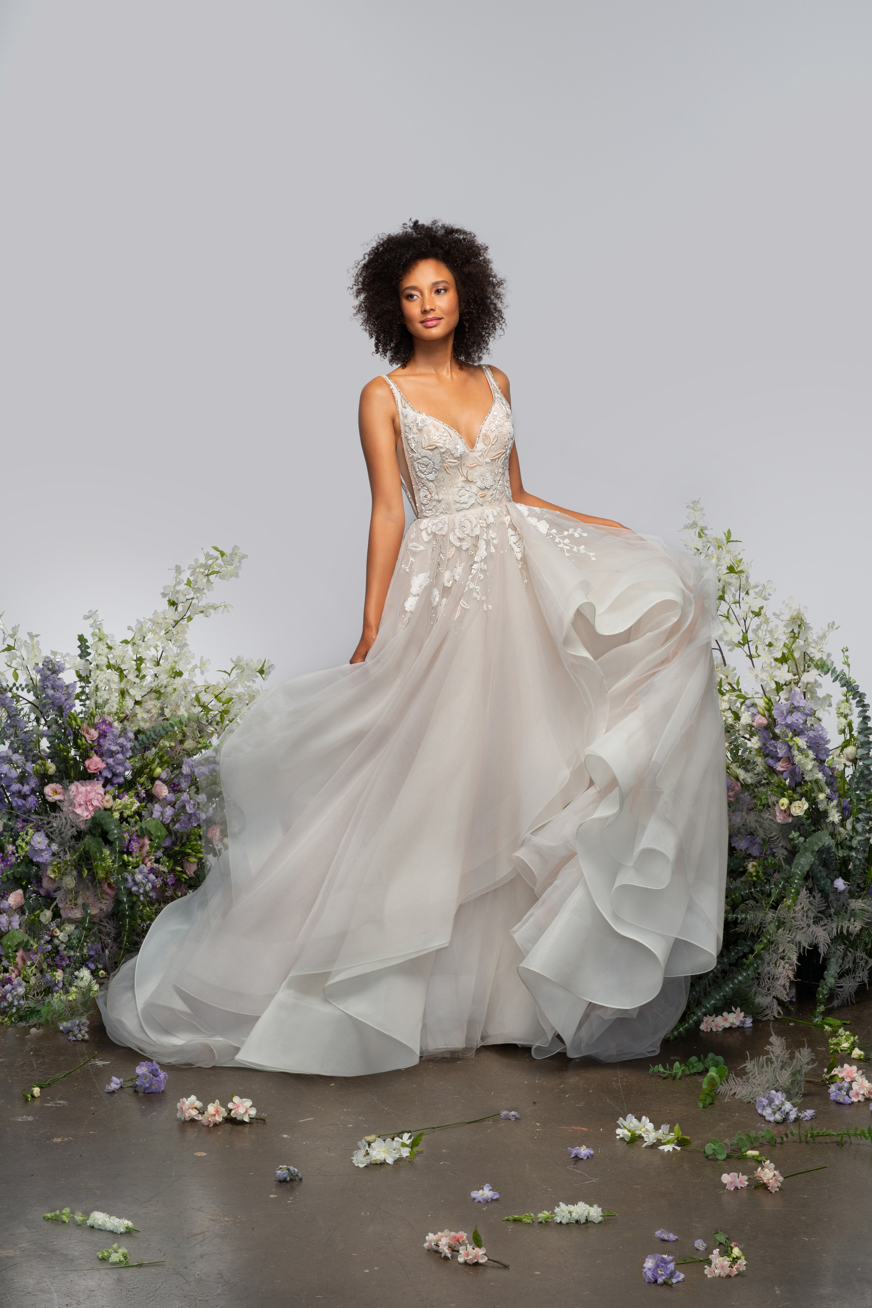 Hermione Published February 19, 2023 at 3000 × 4500 Hayley Paige Hermione sz12 Rose beaded tulle ball gown, curved V-neckline and sheer V-back with rhinestone trim, illusion side cut out detail, floral beaded embroidery trickling into the cascading tulle skirt.