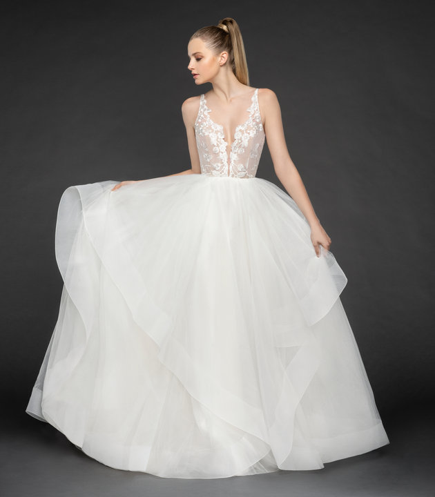 Iris Published February 26, 2023 at 630 × 720 Hayley Paige Iris sz10 Floral embroidered tulle ball gown, plunging V-neck bodice with floral applique and cashmere lining, open keyhole back and cascading tulle skirt with horsehair trim. Matching veil available