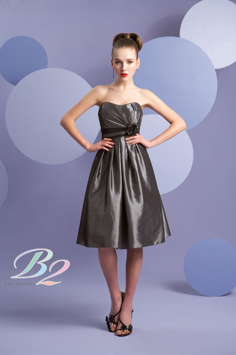 b3085 Published July 18, 2015 at 960 × 1443 B2 B3085, sz 12 Platinum Knee length strapless luxe taffeta gown with a contrasting band at the waist