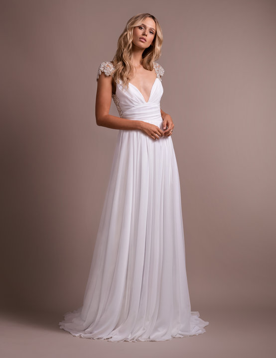 kemper Published September 21, 2021 at 554 × 720 Hayley Paige Kemper sz10 Chiffon A-line gown, floral rhinestone cap sleeves and draped sweetheart neckline, low back with beaded frame, flowing chiffon skirt.