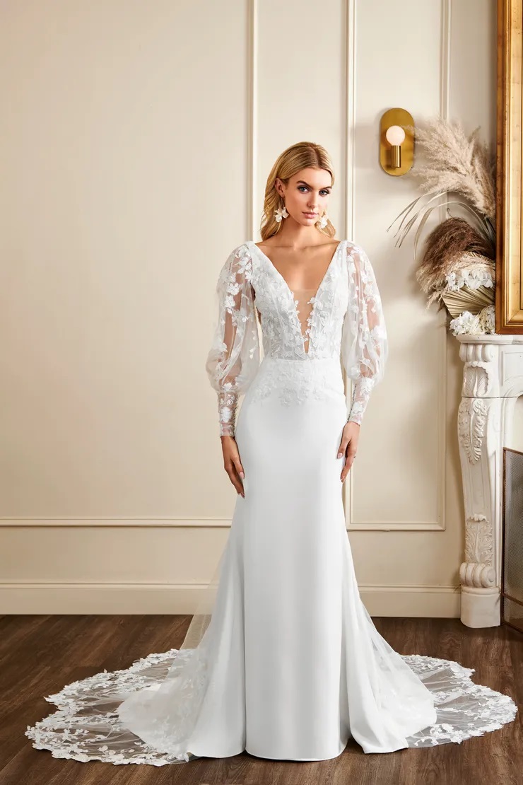 kennedy Published November 13, 2025 at 740 × 1110 Kelly Faetanini Kennedy sz12 Lace and crepe fit to flare gown, detachable tulle bishop sleeve and godet train.