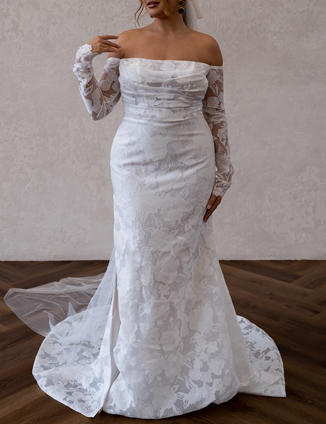 kennedy Published July 16, 2025 at 672 × 874 MWL Kennedy sz18 Truly elegant and classic, but sure to turn heads with her statement floral lace and intricate bodice rouching. Sheer off-shoulder sleeves