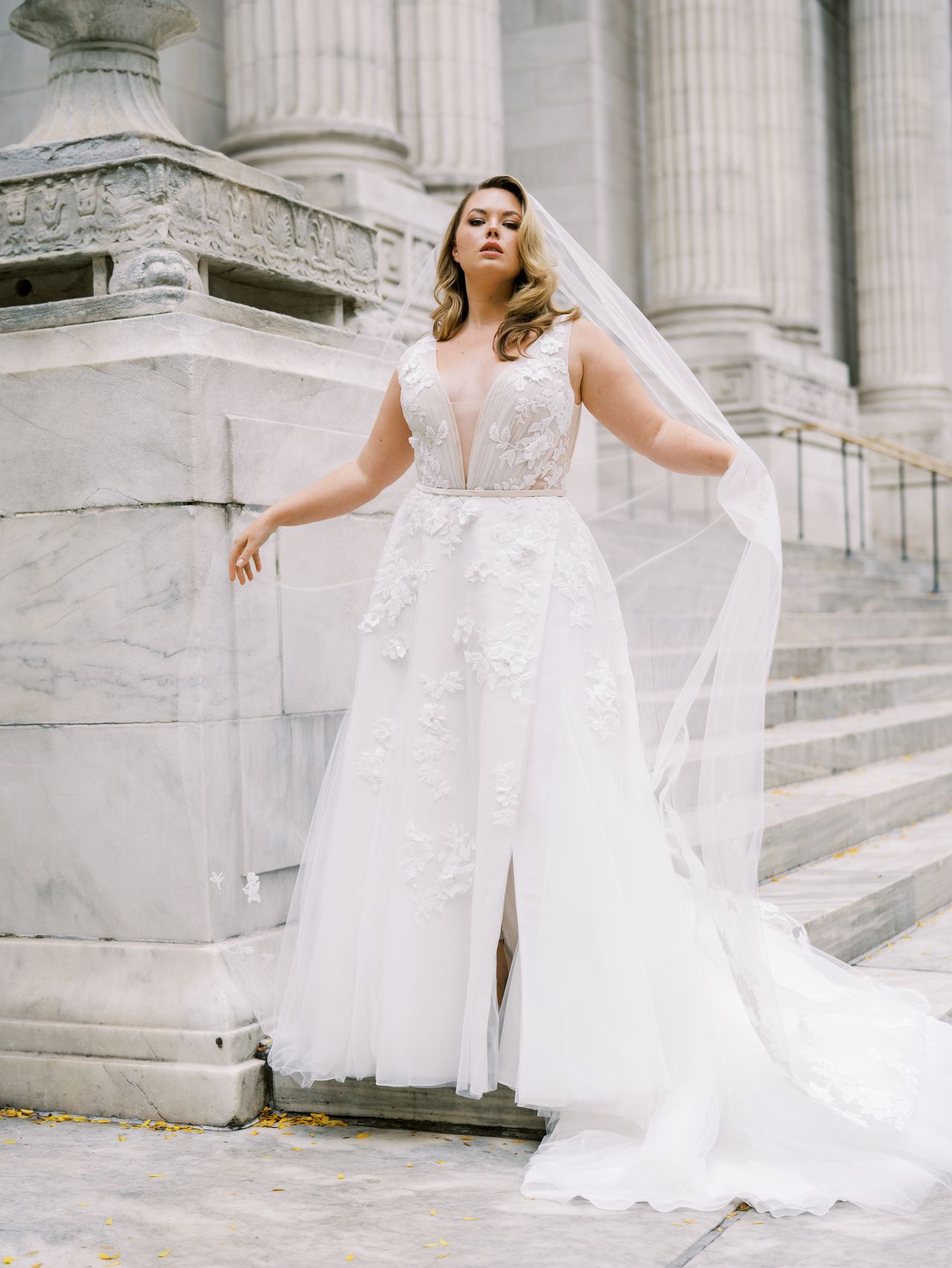 kinsley Published November 17, 2025 at 1280 × 1705 La Curve Kinsley sz16 Lace embroidered A-line with slit, V draped neckline. Matching veil available