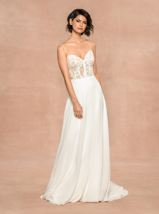 Liv Published November 6, 2022 at 533 × 720 Hayley Paige Liv sz12 Lace and chiffon A-line gown, sheer corset bodice with ivory lace and exposed boning detail, flowing chiffon A-line skirt.