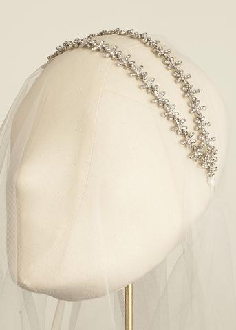 Lulu double band Published June 11, 2021 at 343 × 480 Lulu double band A delicate floral twinkly hairband. Made from Swarovski crystal accents flowers. Rhodium silver. Finished with satin ribbon ties.