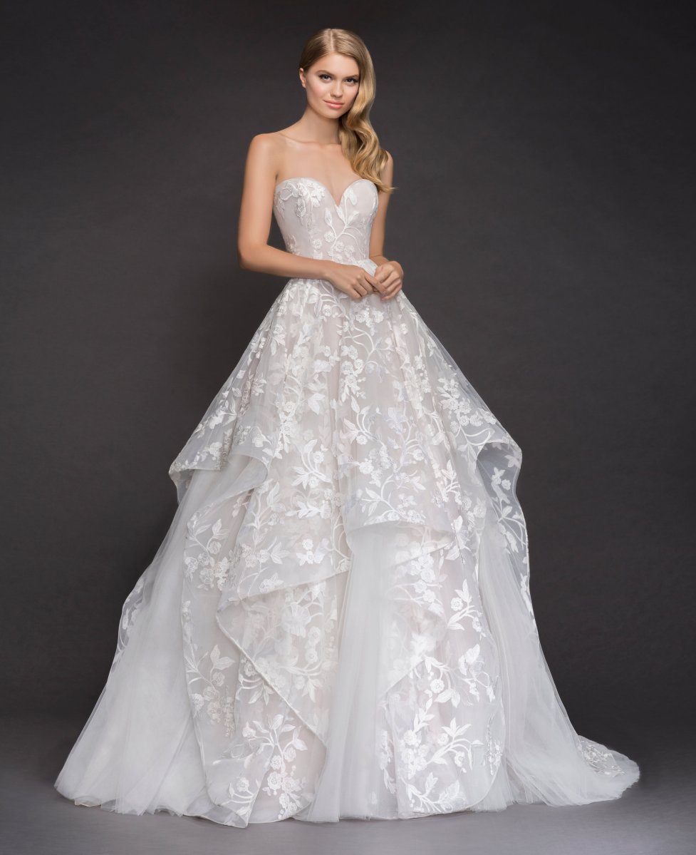 Lulu Published October 30, 2022 at 3000 × 3684 Hayley Paige Lulu sz2 Ivory floral embroidered tulle ball gown, strapless sweetheart bodice, cascading tiered skirt with cashmere lining and horsehair trim. Matching veil available