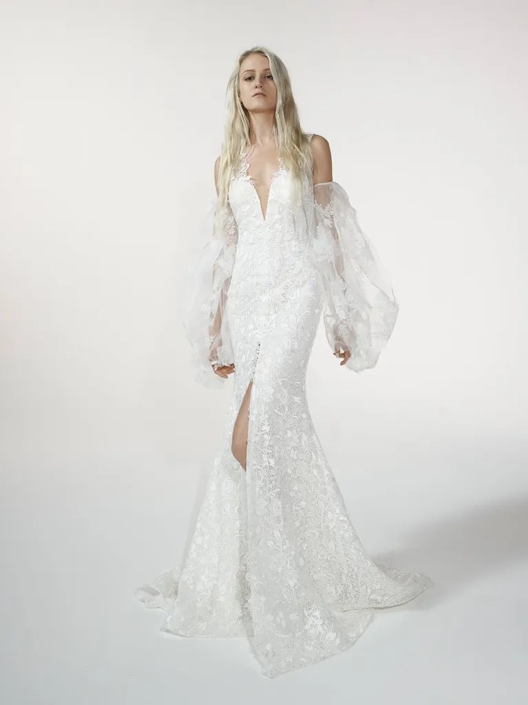 Luminosa Published October 18, 2025 at 767 × 1023 Vera Wang Luminosa sz8 A fitted dress made romantic and feminine with all-over guipure lace. Deep V neckine and high center slit on the skirt. No sleeves.