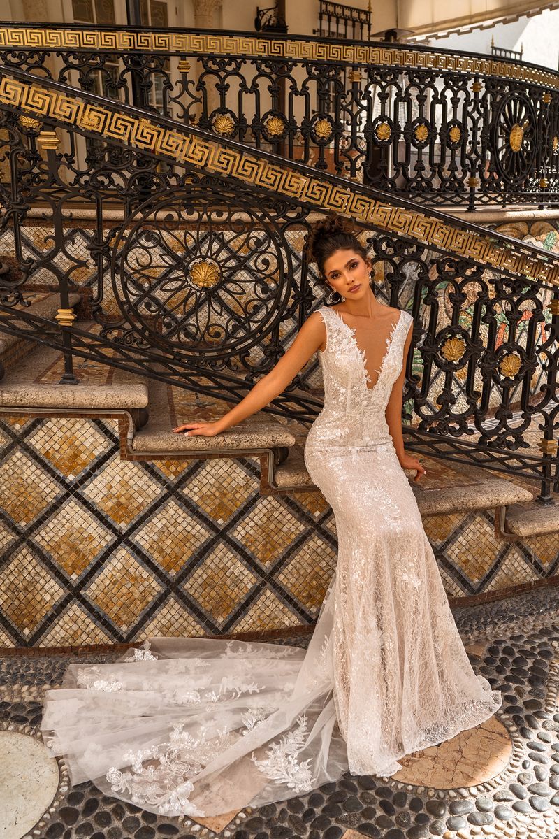 margaret Published September 6, 2023 at 800 × 1200 Aria Margaret sz16 Charming allover sparkle Chantilly lace. Delicate paneling and lightweight flowing train elongate the figure. Open V-back and plunging neckline.