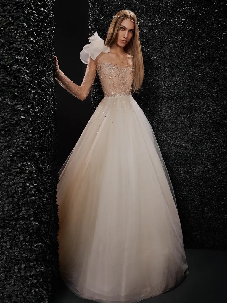 Marion Published October 18, 2025 at 767 × 1023 Vera Wang Marion sz10 Glittering ball gown in a soft nude gold. Semi sheer bodice with illusion sleeves. Lightweight tulle skirt with sparkle on hips. Finished with row buttons and shoulder floral accent.