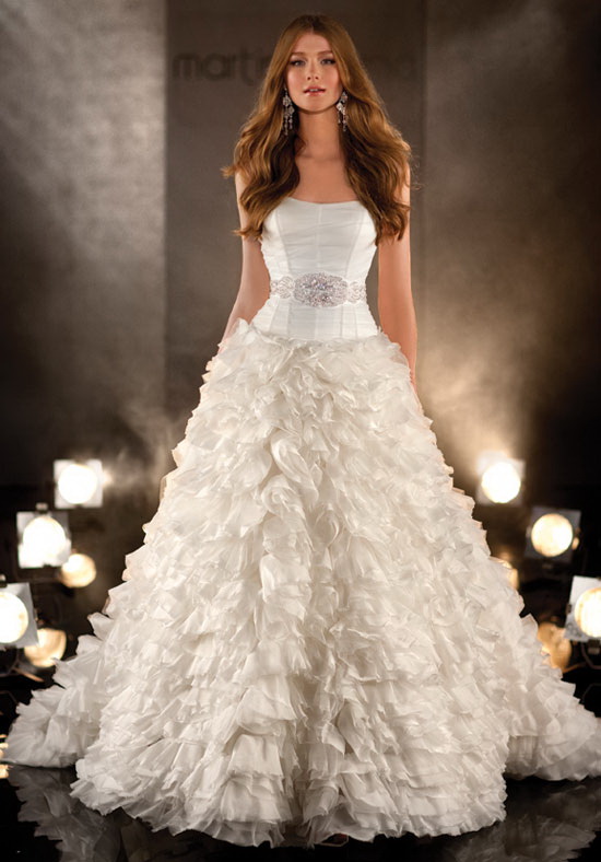 334 Published July 9, 2013 at 550 × 788 Martina Liana 334 sz12 Tulle covered bodice with vertical boning. Layered frills covering skirt are made of Silk Chiffon and French Tulle make for an endearing tattered look. Crystal button back and jeweled belt.