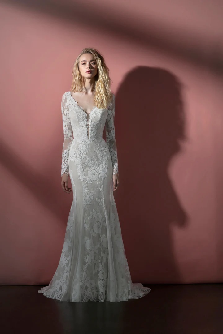 miles Published September 1, 2023 at 720 × 1080 Hayley Paige Miles sz 10 14 Lace fit to flare, plunging sweetheart neckline, full lace sleeves, low scoop back with crisscross strap, fitted through hip with cashmere lining and scalloped train.