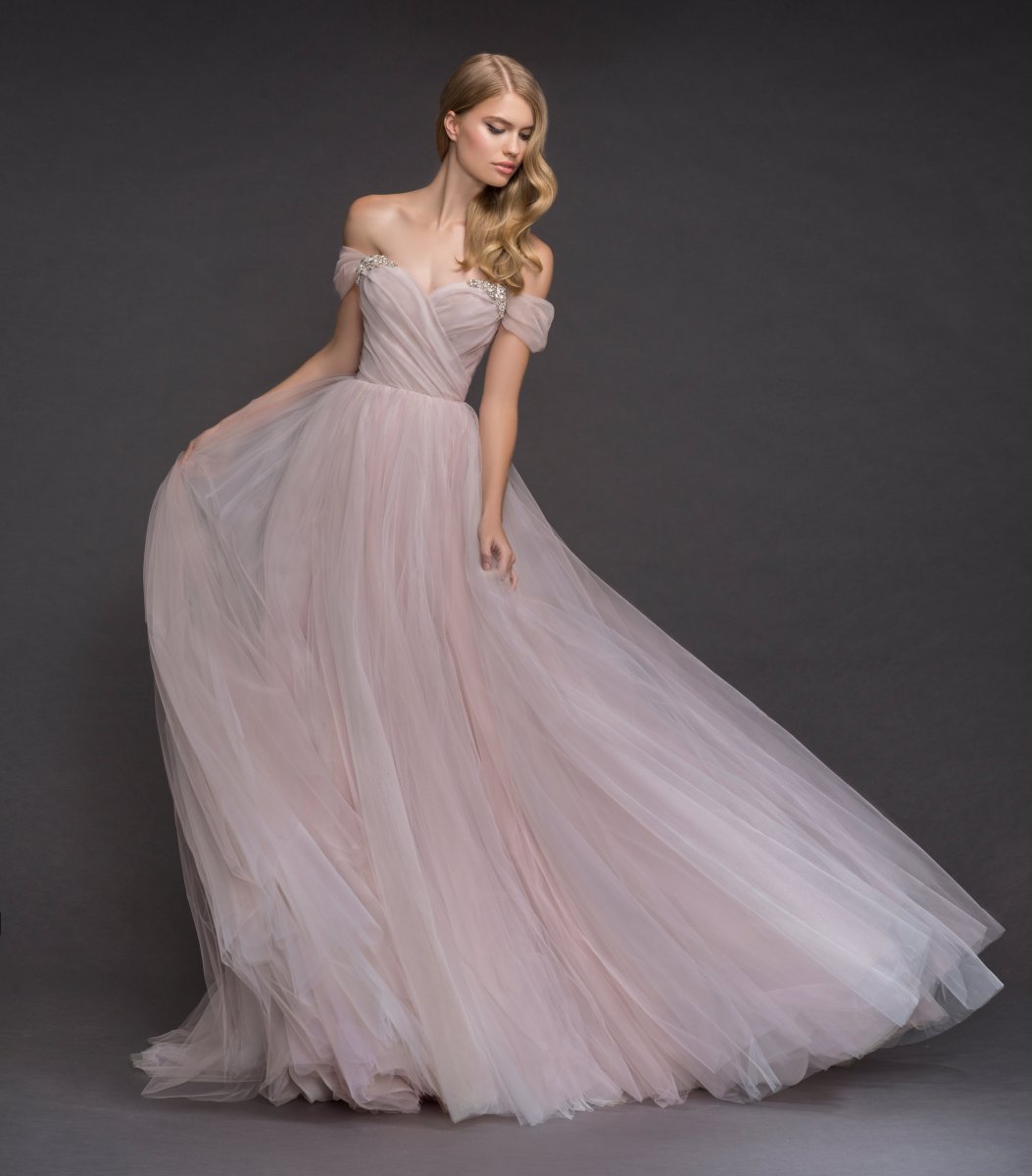 milo Published January 4, 2021 at 3000 × 3420 Hayley Paige Milo sz12 Hydrangea draped tulle ball gown, sculpted sweetheart bodice, removable off shoulder embellished cap sleeve, full tulle skirt.
