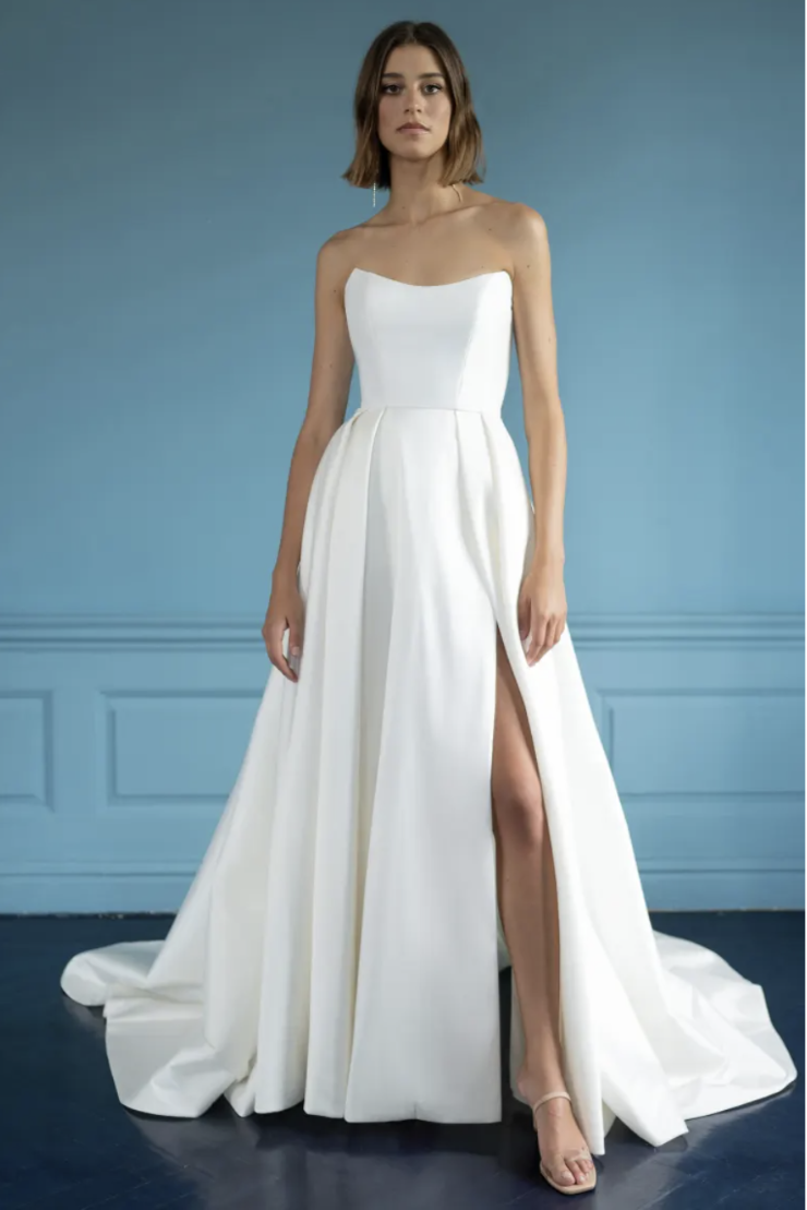 The Mollie gown adds thoughtful details to a classic silhouette. Featuring a beautifully structured bodice with a sultry scoop neckline with high peaks, the full A line skirt is elevated by box pleats and a dramatic side slit. The sheer illusion back with exposed boning ensures a beautiful view, and covered buttons to the hem