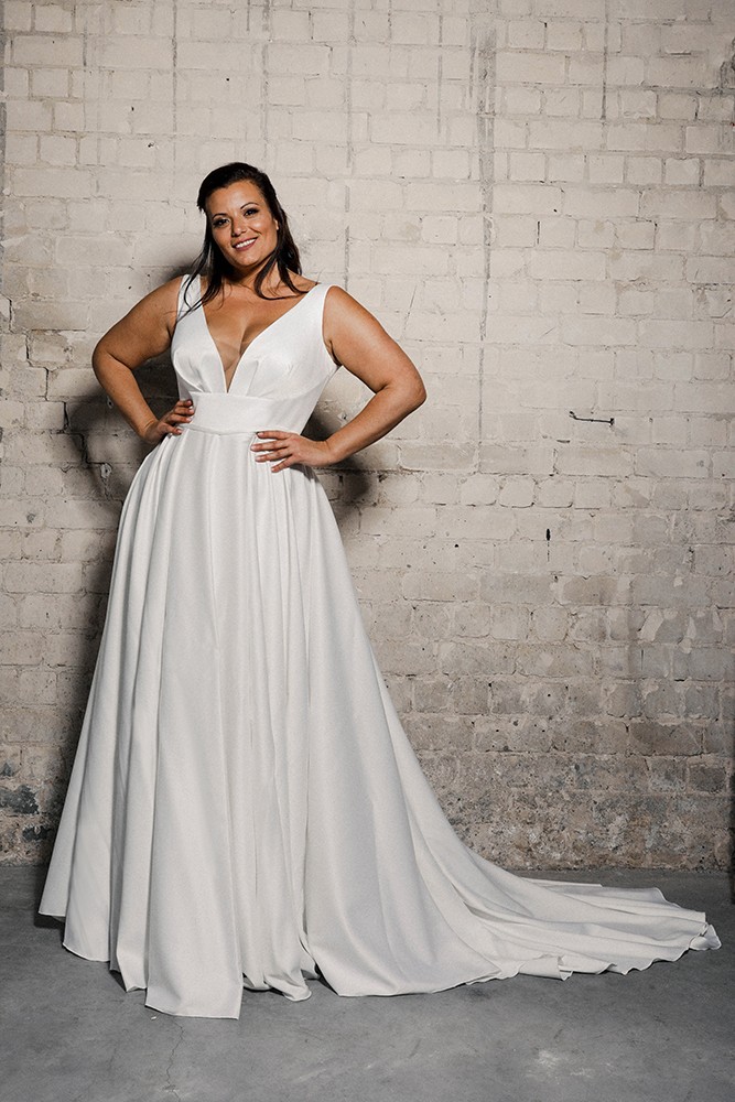 Featuring a fitted bodice with waistband that highlights your shape, the gown falls into a soft a-line skirt. This beautiful gown also has the options for cap sleeves or just a V