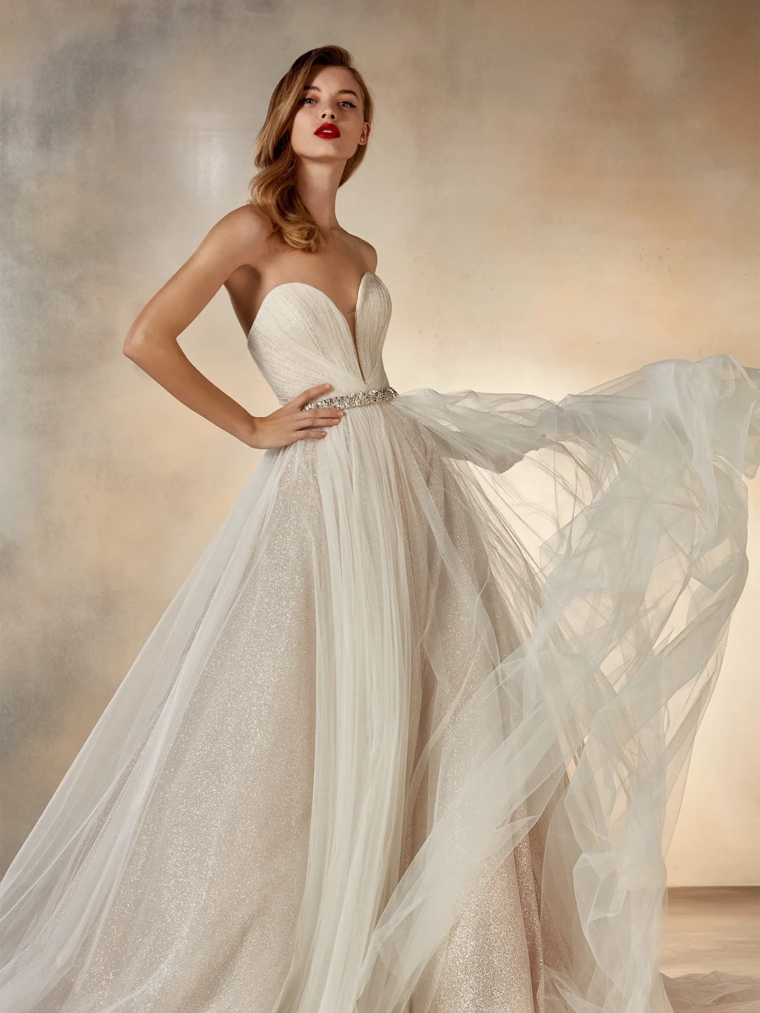 Night Published October 9, 2022 at 1536 × 2048 Pronovias Atelier Night sz12 Strapless ballgown in soft tulle over glittering lining, with plunging sweetheart neckline, hand-draped bodice. Belt not included