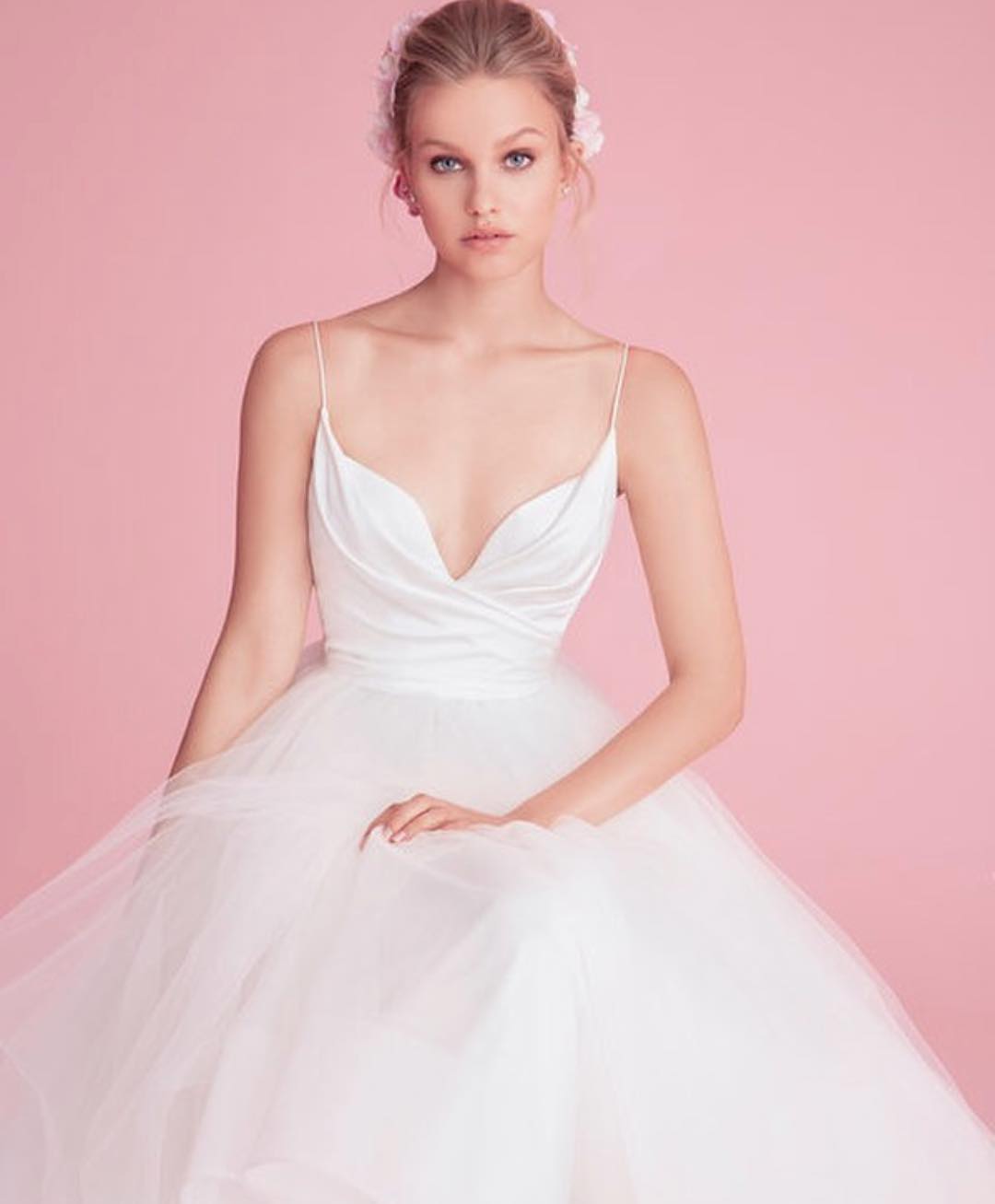 olympia Published December 12, 2020 at 1080 × 1307 Hayley Paige Olympia sz12 Crepe and tulle ball gown, draped cross over bodice with curved V-neckline, full tulle skirt.
