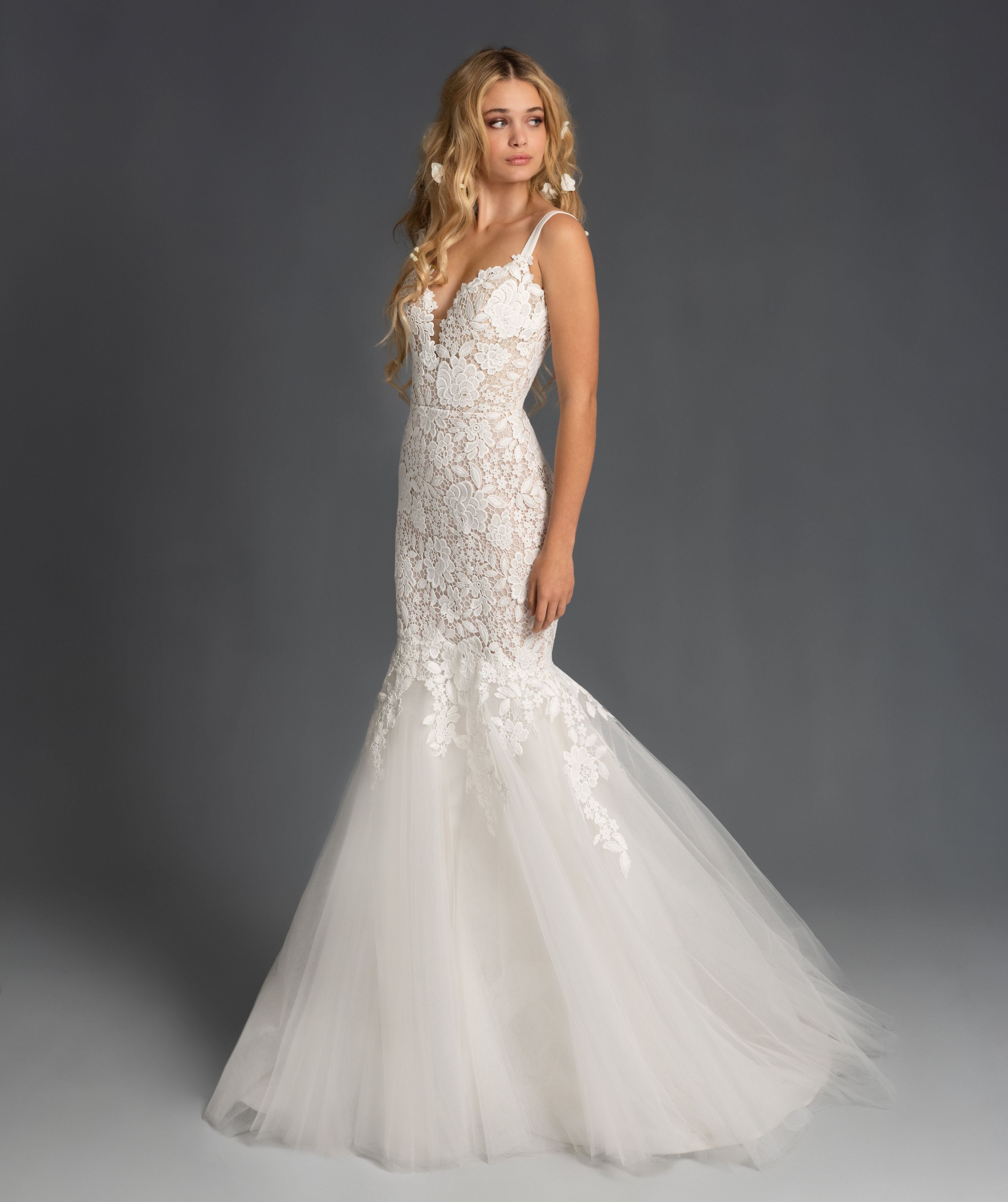 pierre Published September 21, 2021 at 3000 × 3577 Hayley Paige Pierre sz12 Ivory guipure lace and tulle fit-to-flare gown, sweetheart neckline and low scoop back with cross strap detail, nude contrast lining and tulle skirt with lace applique. Matching veil available