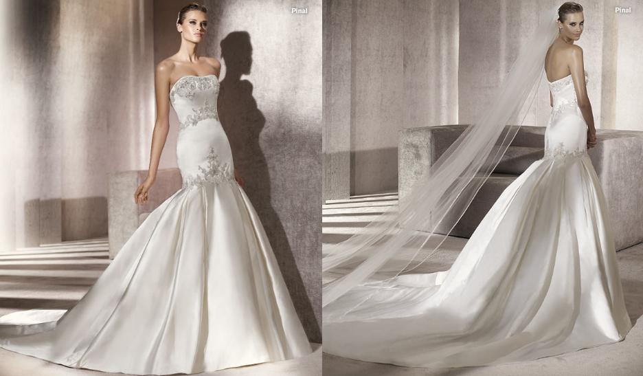 pinal Published June 19, 2015 at 936 × 547 Pronovias Pinal sz12 Strapless Geneve satin drop waist fitted gown with beading and pleated skirt
